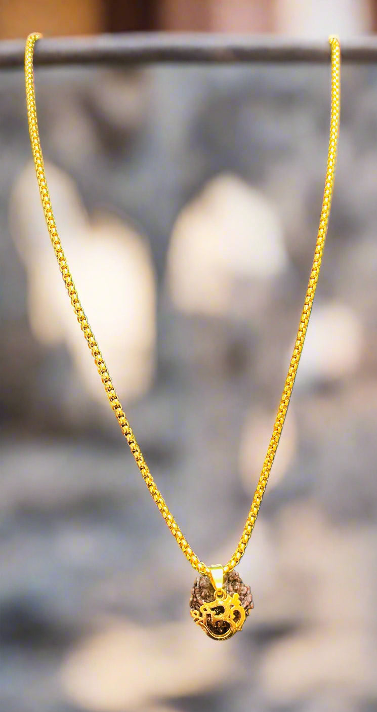Embody the essence of spiritual power and calm with this elegant Om Rudraksha Pendant with Chain, specially designed for men who walk with both style and purpose. Featuring a sacred Rudraksha bead framed by the powerful symbol of โเฅโ (Om), this pendant channels divine vibrations while the gold-colored alloy chain gives it a bold, masculine finish.
